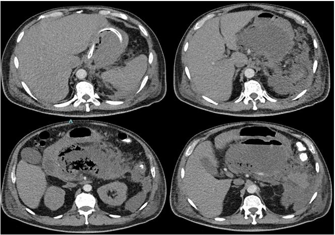 Figura 1. TC de abdomen simple y contrastado Ingreso en UCI: colecciones evidentes a nivel de cuerpo gástrico y duodeno, con múltiples burbujas, nivel hidroaéreo; la de mayor tamaño es de 86×180 × 110 mm; otras, localizadas posteriormente a parénquima esplénico, a nivel parrarenal izquierdo, en corredera parietocólica homolateral, y a nivel del mesenterio, con marcada alteración tomodensitompetrica de los planos adyacentes y ganglios locorregionales.