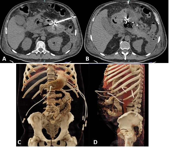 Figura 2. A y B. TC de abdomen simple; colocación de catéteres percutáneos. C y D: reconstrucción 3D donde se evidencia la posición de los catéteres implantados.