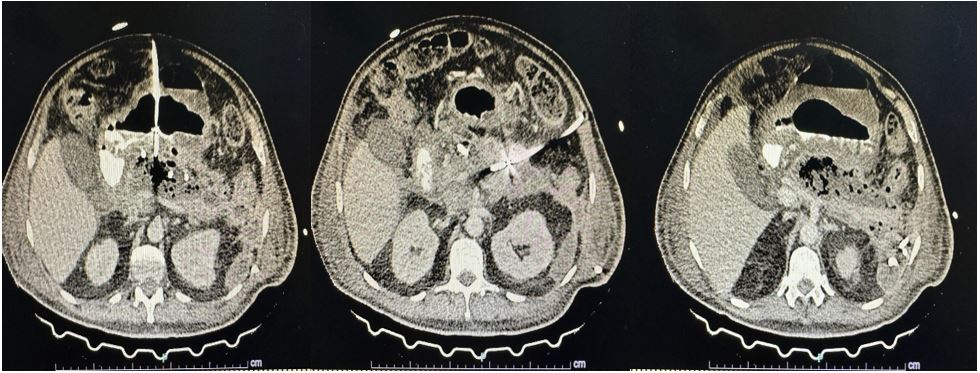 Figura 3. TC de abdomen simple y contrastado control: catéteres dirigidos a colecciones en la transcavidad de los epiplones, retrogástrico y pararrenal anterior, con aisladas imágenes de densidad aérea en menor cuantía en relación con el estudio previo.