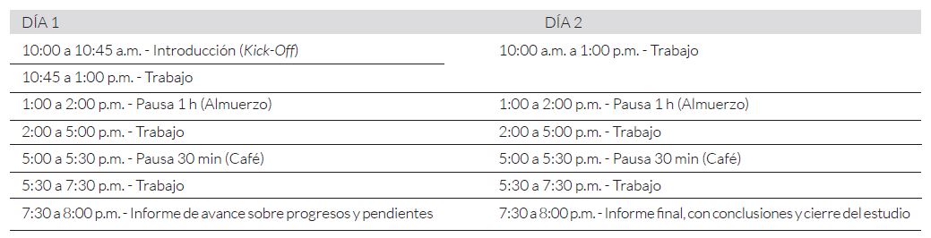Elaboración propia, sobre la base de 2 días de trabajo con jornadas de 10 horas, contemplando 1,5 horas de pausas con comidas. Adaptada de un ejemplo real de Observational Health Data Sciences and Informatics (OHDSI). Disponible en: https://www.ohdsi.org/ohdsi2020-symposium-study-a-thon/