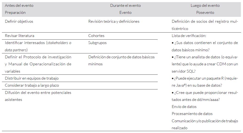 Durante el evento se fusionan las experiencias, las herramientas, los métodos, las habilidades, los datos y los conocimientos para realizar estudios observacionales y colaborativos en red con datos del mundo real, definido como “aquellos relacionados con el estado de salud del paciente y/o la prestación de atención médica recopilados rutinariamente de una variedad de fuentes”9. Existen varias experiencias publicadas10,11, que utilizan red de bases de datos que incluye registros poblacionales, o información extraída desde historias clínicas electrónicas sobre una población objetivo y subgrupos predefinidos por ciertas características únicas12.
