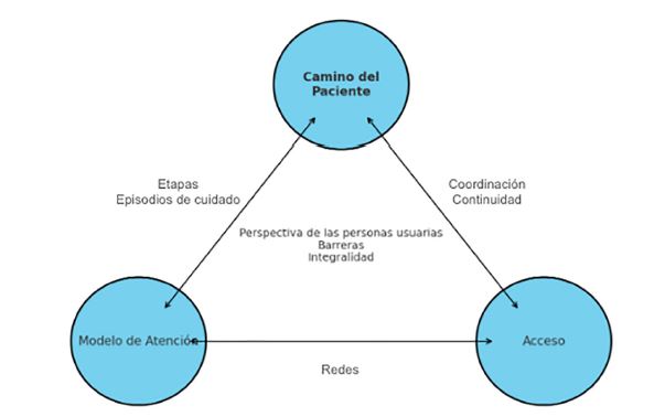El marco conceptual presentado es innovador, ya que integra contribuciones de diversas corrientes. Como da cuenta la figura 1, a continuación, se ponen en diálogo los enfoques teóricos relacionados con el diseño y la gestión del sistema de salud y sus instituciones (modelo de atención), los estudios sobre acceso y, finalmente, las perspectivas que analizan los trayectos y experiencias de las personas usuarias (camino del paciente). El interés por comprender la perspectiva de los sujetos investigados y las dificultades que enfrentan requirió adoptar enfoques atentos a los territorios y sus barreras, la integralidad y la participación. Asimismo, nociones como redes, coordinación, continuidad, etapas y episodios de cuidados se tornan centrales para considerar y definir, dado el objetivo del estudio que enmarca esta revisión bibliográfica.