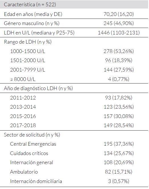 Durante el período evaluado se registraron 542 pacientes mayores de 18 años con al menos un valor de LDH igual a 1000 U/L o mayor. Se excluyeron 20 pacientes (3,69%) debido a una condición preanalítica de la muestra, por lo que finalmente se incluyeron 522 casos (96,31%) para el análisis.
