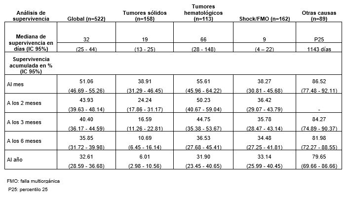 En la tabla 3 se observa la mediana de supervivencia y la supervivencia acumulada al mes, a los 2, 3, 6 y 12 meses del total de pacientes con LDH extremadamente elevada, y discriminado por etiología (análisis univariado). Se destacó la curva de supervivencia de los pacientes con enfermedades oncológicas sólidas, que presentaron mayor mortalidad en el transcurso del primer año de seguimiento.
