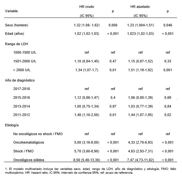 La edad, el sexo masculino, el diagnóstico de enfermedad oncológica sólida, el diagnóstico de enfermedad oncohematológica, el diagnóstico de shock y/o FMO de cualquier etiología, un rango de LDH mayor de 2000 U/L y el diagnóstico de la LDH extrema durante los años 2011-2012 se asociaron independientemente a mayor riesgo de muerte en el período de seguimiento del estudio.