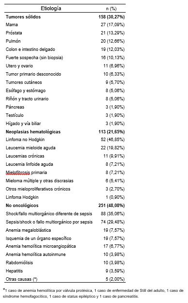 En la tabla 2 se describen las etiologías discriminadas por grupo que explicaron potencialmente los registros de LDH extremadamente elevados de los pacientes.