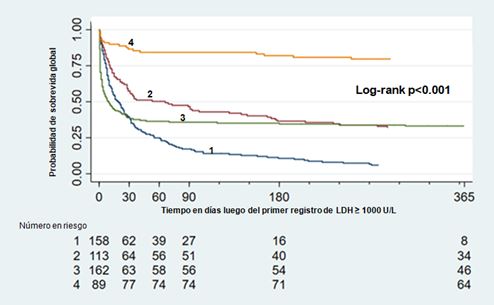 El gráfico de Kaplan-Meier de los pacientes con LDH extremadamente elevada por etiología se observa en la figura 1.