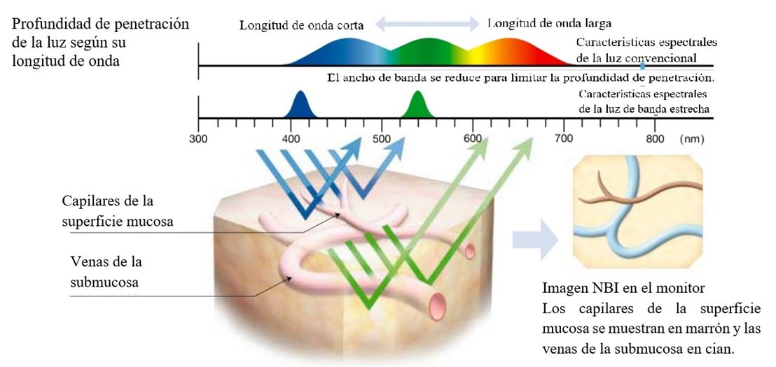 Figura 1. En esta imagen se puede apreciar la penetración de las distintas longitudes de onda de la luz. En el caso de 415 nm - azul, alcanza hasta los capilares de la mucosa y emite luz marrón. En caso de 540 nm - verde, hasta las venas submucosas y emite luz azul cyan - (Figura tomada de Lukes P, y col.5)