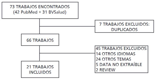 Luego de la revisión se obtuvo un total de 73 trabajos. Se descartaron 7 trabajos por duplicidad. De los 66 trabajos restantes se excluyeron 45 (14 por encontrarse en otro idioma distinto de inglés o español y 31 por centrarse en otras patologías, tecnologías o información incompleta).