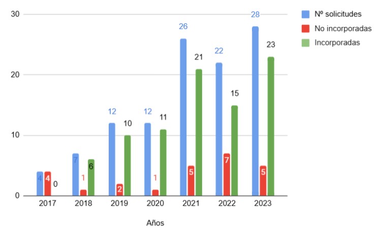 Figura 2.Número de solicitudes totales, no incorporadas e incorporadas por año.