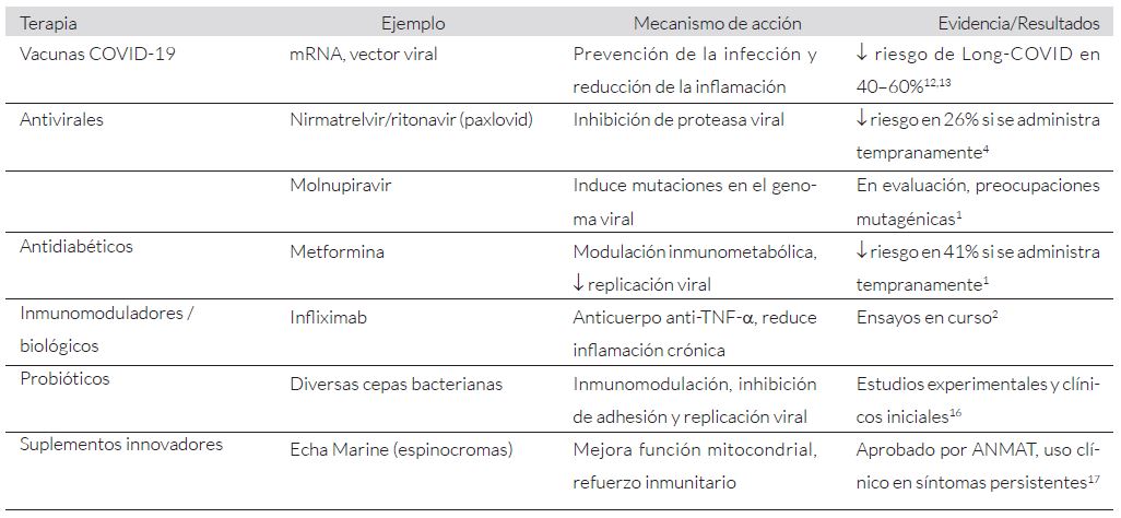 La vacunación reduce el riesgo de COVID persistente en un 40-60%, pero no lo elimina por completo, lo que ha impulsado la investigación de terapias más específicas12,13. Actualmente, no existe un tratamiento aprobado, pero se están evaluando varios medicamentos en ensayos clínicos (Tabla 1).