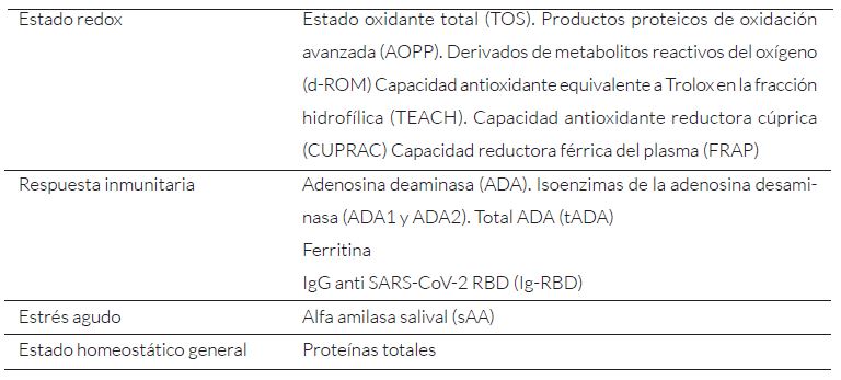 La saliva se ha propuesto como una matriz biológica prometedora para estudiar los cambios fisiológicos asociados al COVID persistente en niños, debido a su fácil recolección, procedimiento seguro y no invasivo28. Un estudio reciente de Tyrkalska y cols. analizó muestras de saliva de 49 niños enfermos y 56 controles sanos del mismo rango etario, evaluando 13 biomarcadores seleccionados por su capacidad para reflejar el estado redox, la respuesta inmunitaria, el estrés agudo y el estado homeostático general29 (Tabla 2).