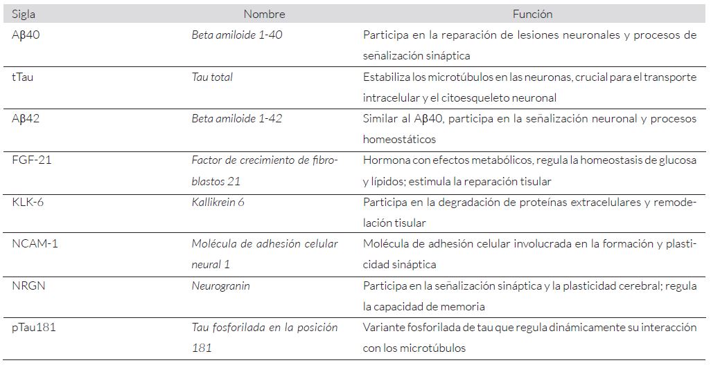 Tabla 3. Función de las proteínas medidas en las vesículas extracelulares derivadas de neuronas (nEVs,por sus siglas en inglés).