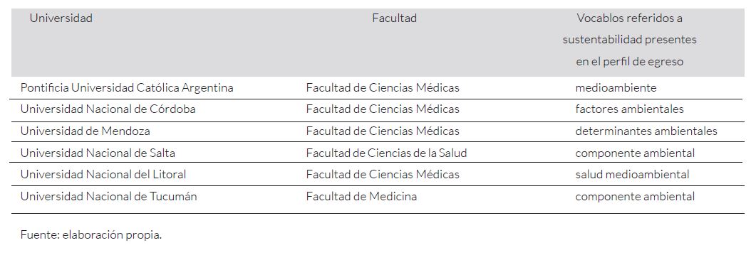 Del total de 47 facultades se seleccionaron 44, ya que no fue posible acceder a los documentos institucionales de la Universidad del Salvador, la Universidad Nacional de La Rioja y la Universidad Adventista del Plata, aun habiendo contactado y solicitado los documentos a sus respectivas direcciones de carrera y secretarías académicas. Del análisis de los perfiles de egreso de las 44 facultades de Medicina, Ciencias Médicas y/o Ciencias de la Salud que ofrecen la carrera de Medicina, se hallaron 6 que hacen referencia a una perspectiva de desarrollo sustentable, en clave del vínculo ambiente y salud de la población, representando un 12,7% de las carreras de Medicina del país.