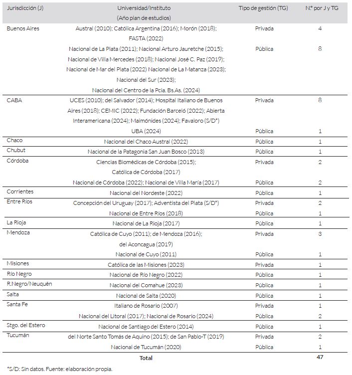 En la Argentina existen 47 instituciones educativas que cuentan con la carrera de Medicina en el Nivel Superior en 16 provincias. Del total, 24 son universidades públicas y 23 son universidades de gestión privada (Anexo 1 y Fig. 1).